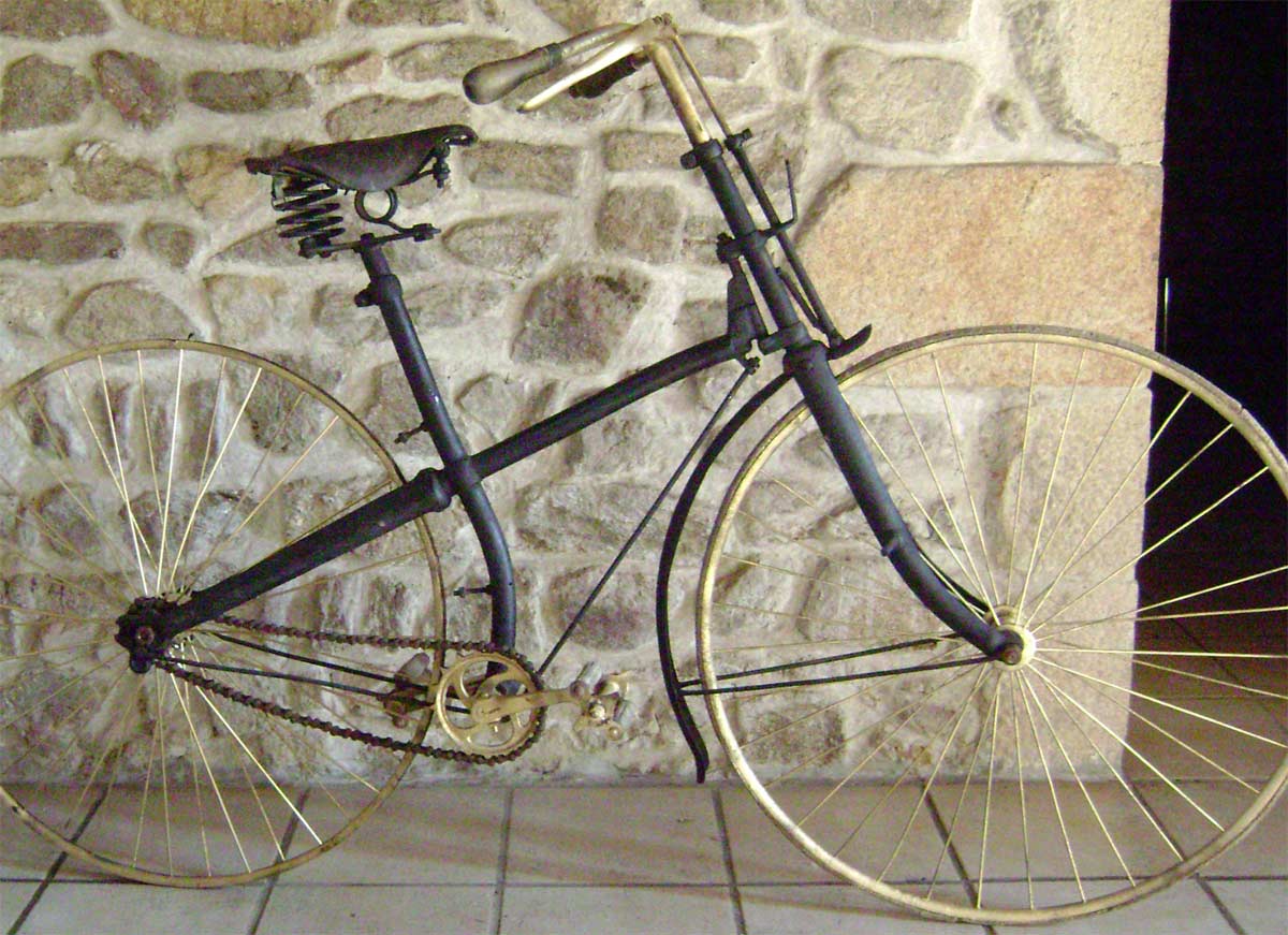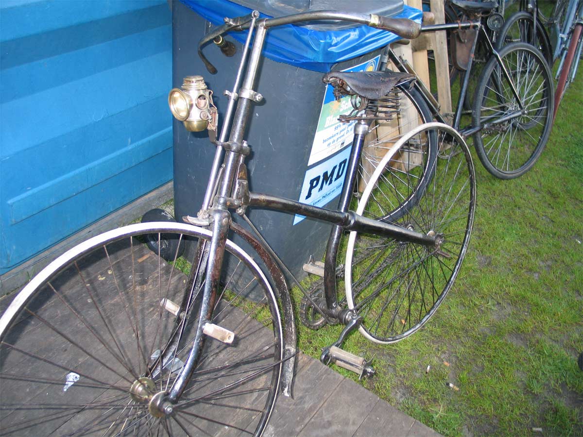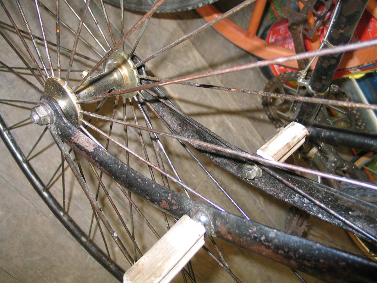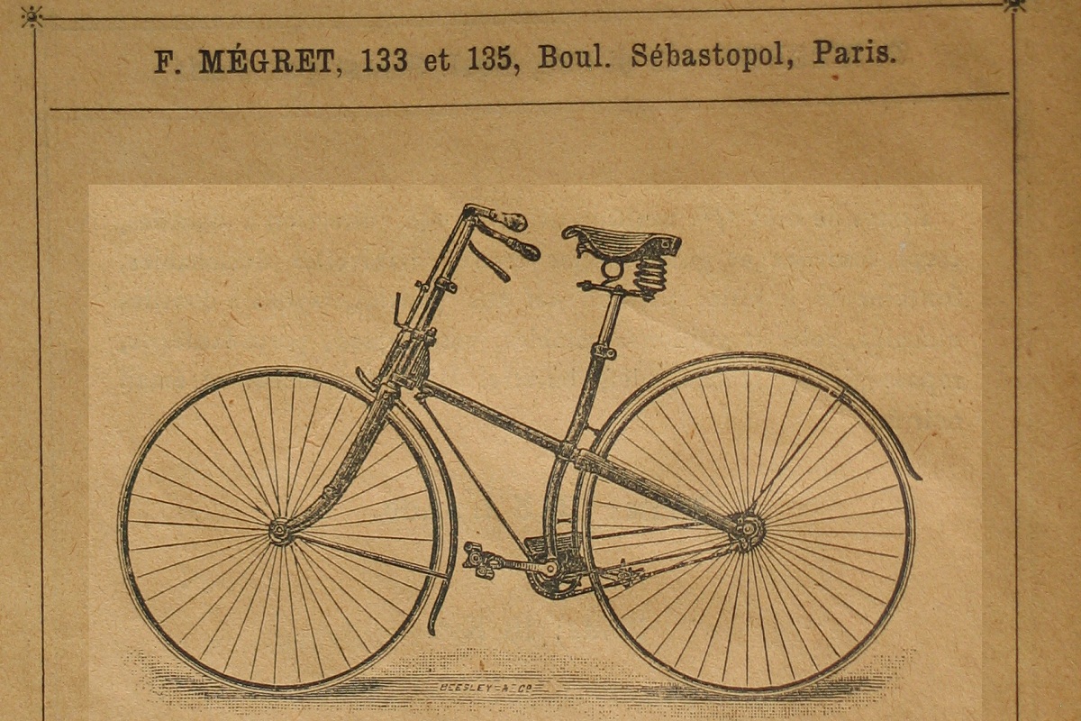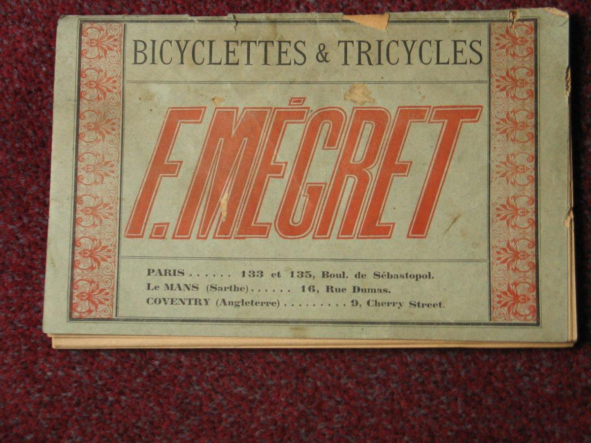 The bike has some interesting details which made identification easy ... when in october 2012 I looked through a lot of antique bicycle catalogues in the Velorama museum. Most specific are the two stays which were used to attach the rear mudguard. And I found it in the catalogue of F. Mégret from Paris, the year is unknown but I guess 1892. Strange is that the catalogue calls it a childrens bike, with small wheels, while the illustration shows no children's bike at all. The bike of my French fellow collector even has the same saddle.